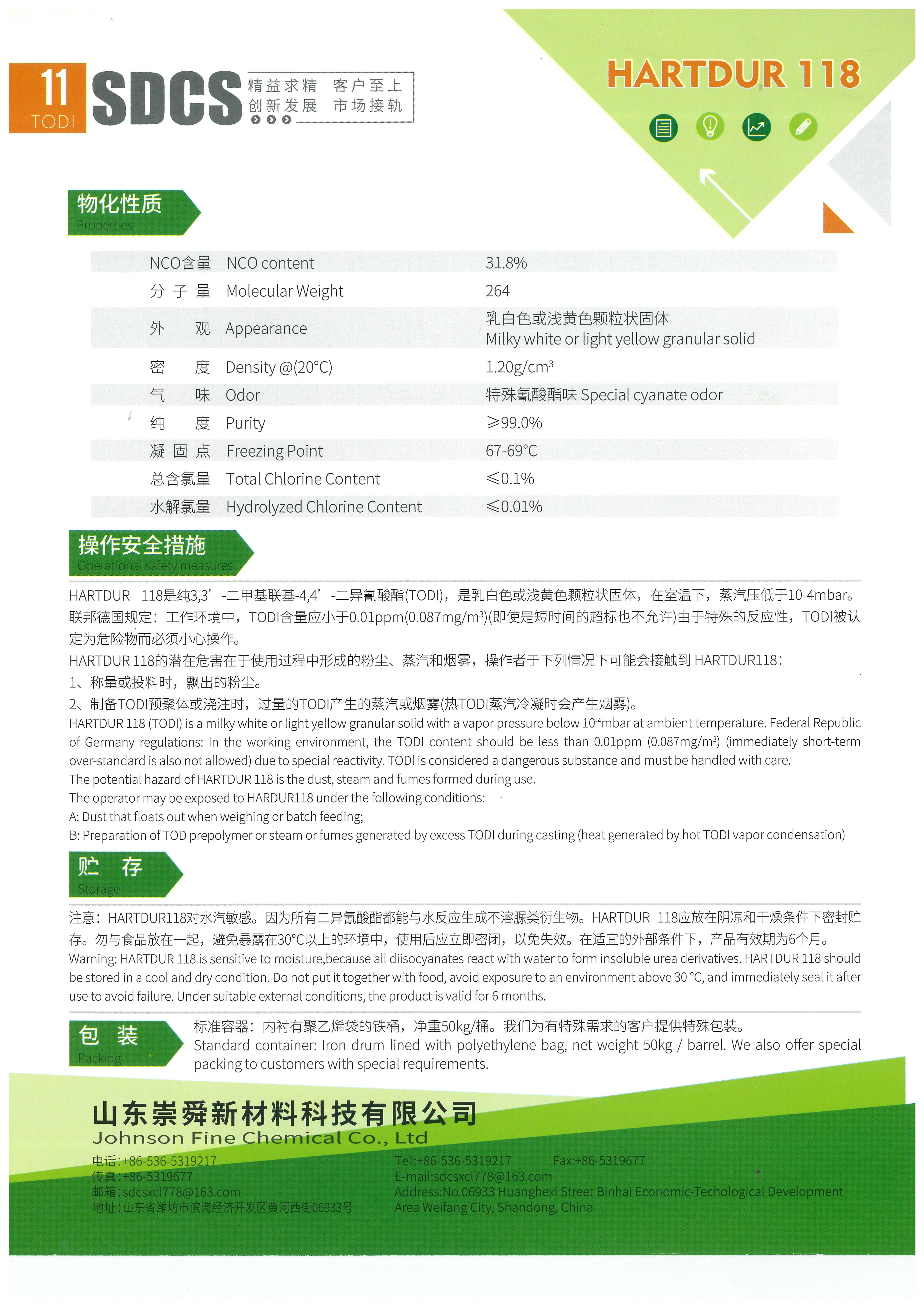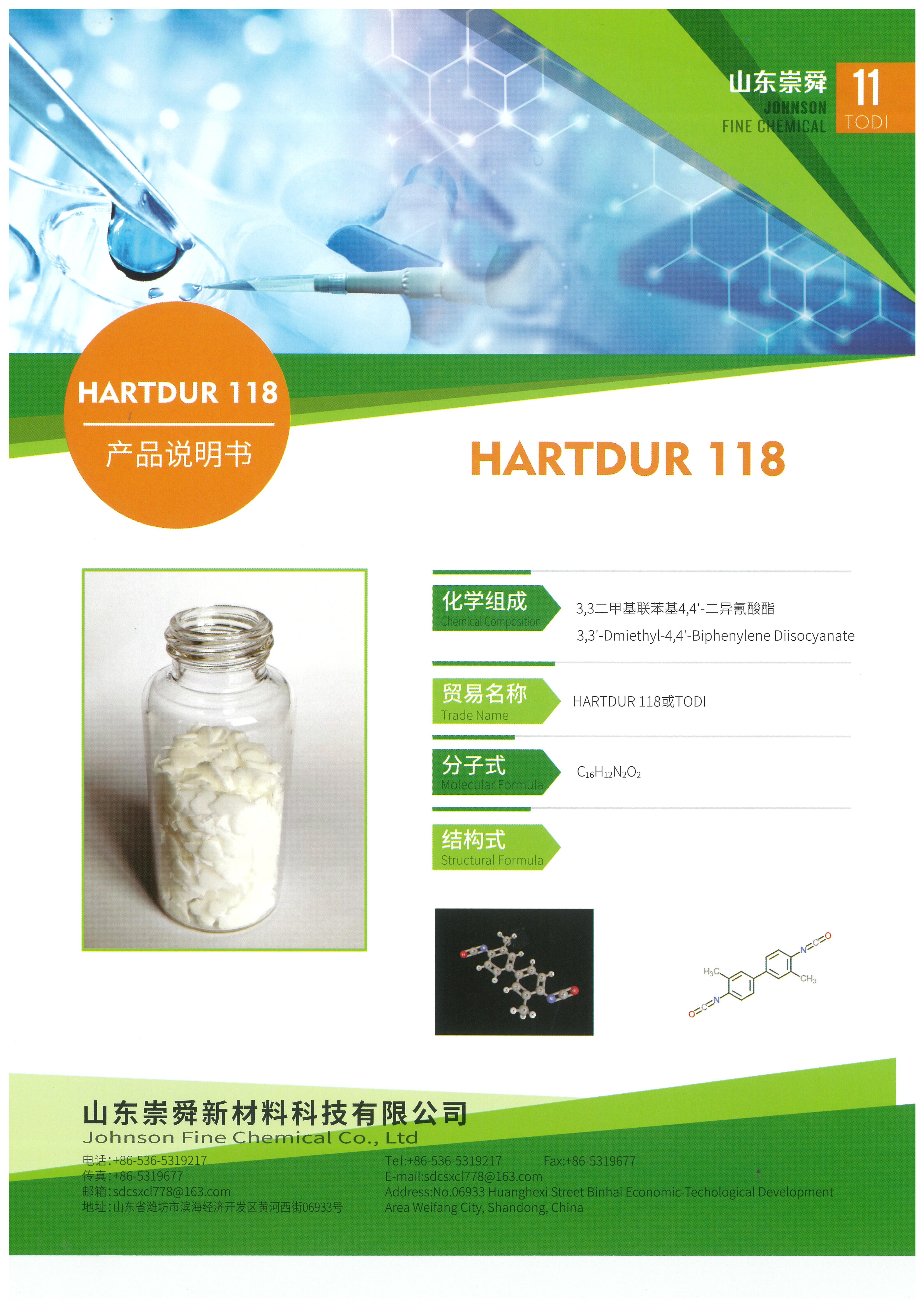 HARTDUR 118 (TODI) 是純度極高的 3,3'-二甲基-4,4'-聯苯二異氰酸酯,以乳白色或淺黃色粒狀固體。在室溫下,蒸汽壓低於10-4mbar。建議工作場所空氣中允許的濃度為 0.01 ppm = 0.087 mg/m3。即使是短時間也不應超過該值。由於具有特殊的反應性,TODI 必須被視為危險物並且小心處理。