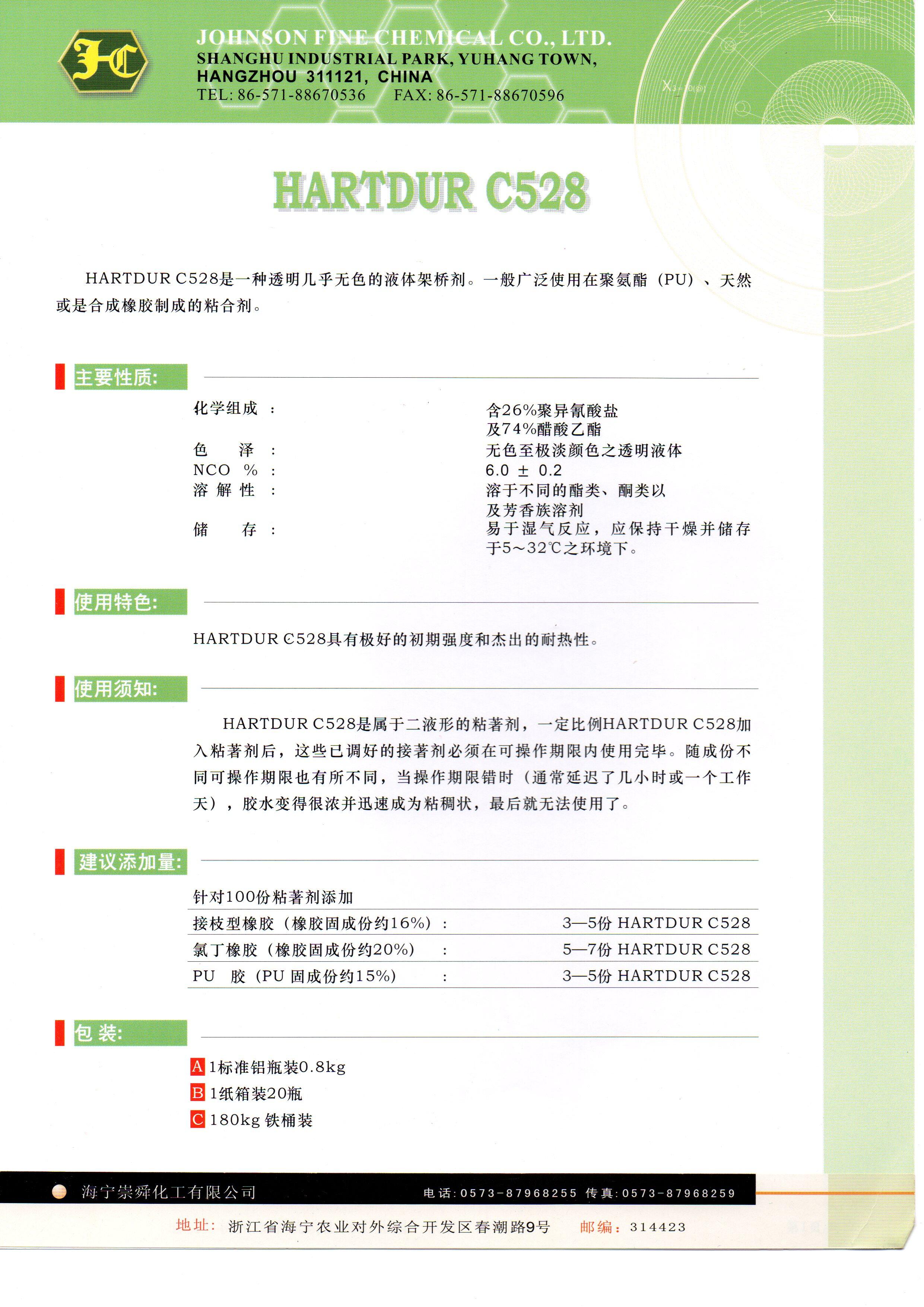 Hartdur C528 是甲苯二異氰酸酯 (TDI) 體系的架橋劑,具有優異的初始接著強度和出色的耐熱性。 Hartdur C528 能提高對難黏物體的附著力,例如含高可塑劑的PVC、含油量多的SBR、頭層皮革、絲綢等,特別適用於聚氨酯糊劑(PU糊)。 主要應用於鞋類行業。