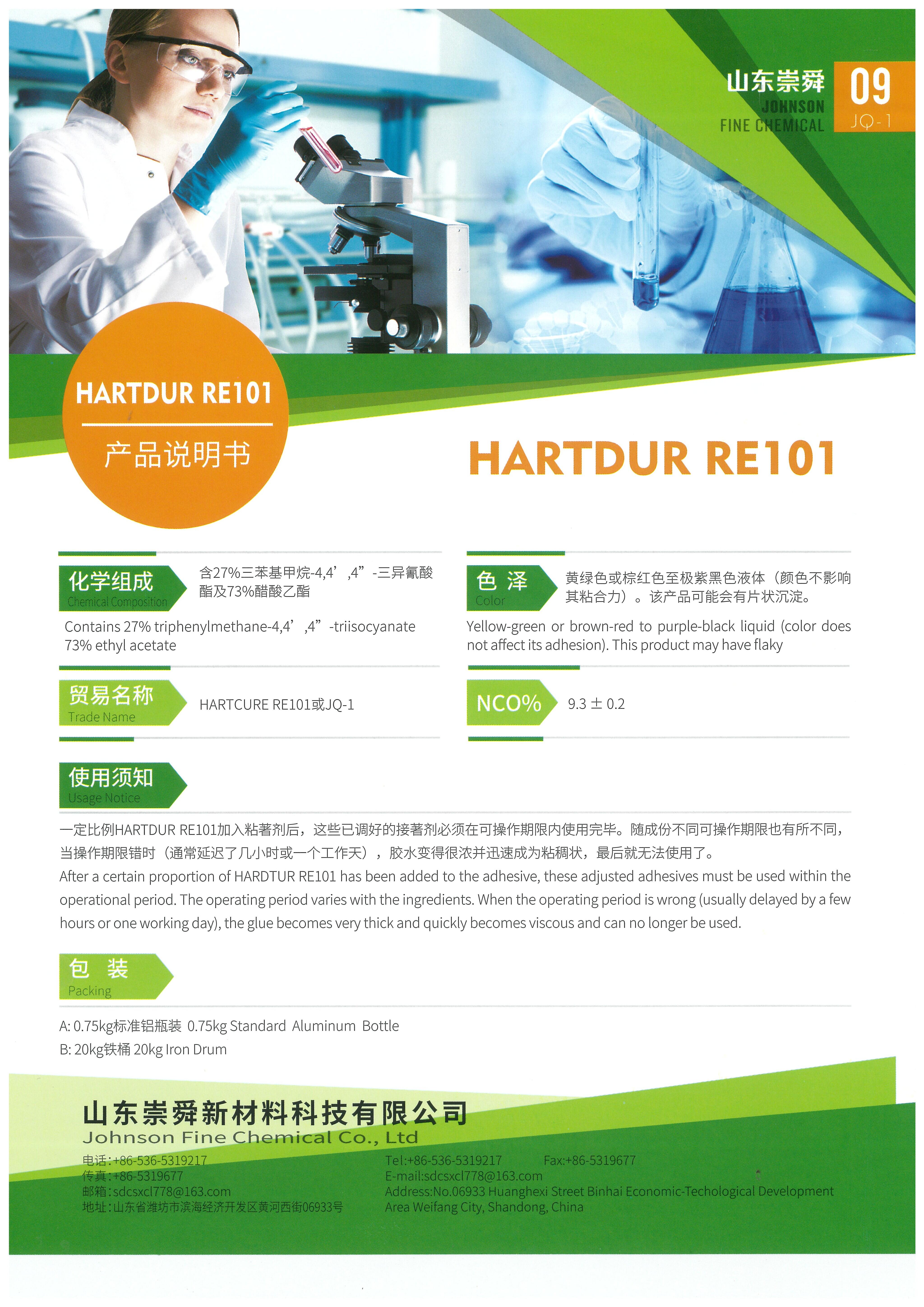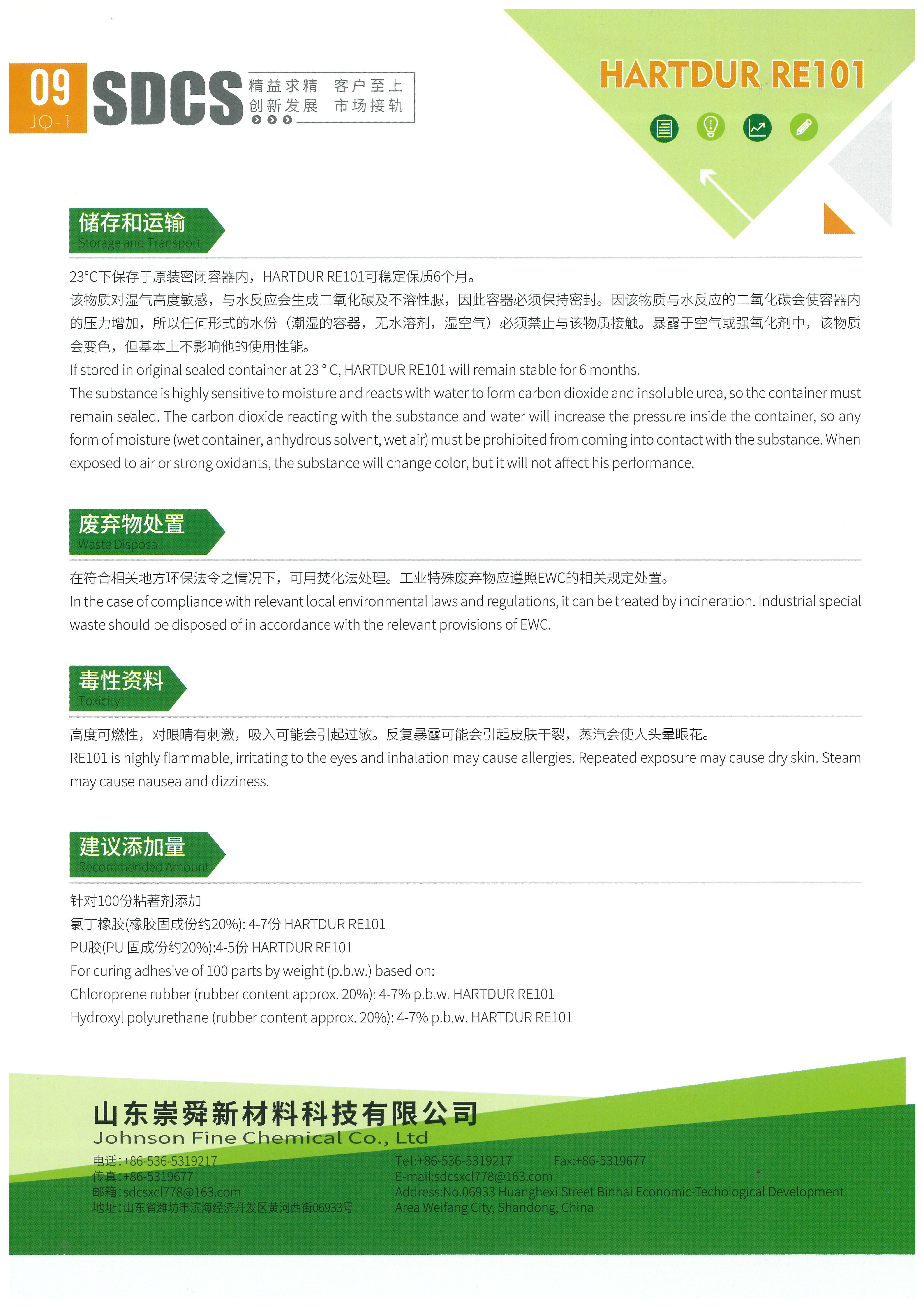 Hartdur RE101 作為雙組分黏著劑之架橋劑,在黏著劑中加入一定比例的 Hartdur RE101 後,混合後的雙組分黏著劑應在適用期(Pot Life)內施作,Hartdur RE101 的添加量不僅取決於黏著劑其橡膠含量,還取決於其他成分配方(例如樹脂、抗氧化劑、溶劑等)的比例。 如果未在操作時間內使用黏著劑,它將會變得越來越難以塗抹,且粘度會迅速增加,直到最終出現凝膠/膠體,屆時已無法使用。