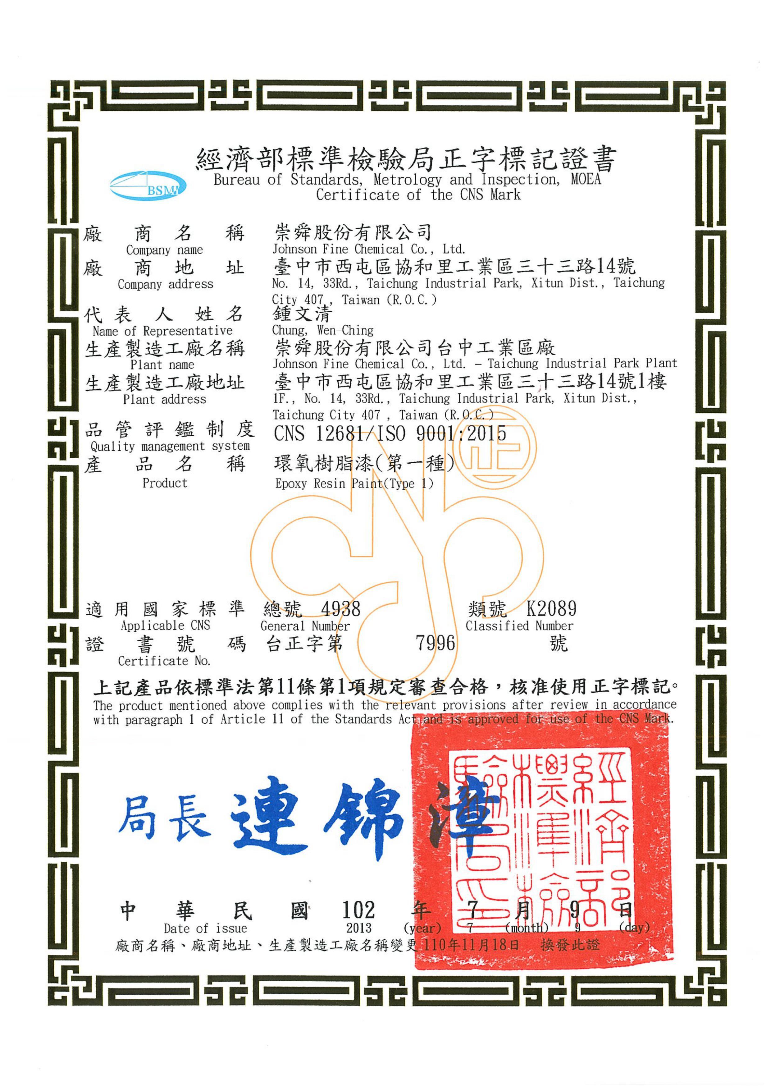 致力於提供客戶最優質的產品,崇舜的EPOXY環氧樹脂地坪塗料符合中華民國國家標準(CNS),身為生產製造工廠,本司採行之品質管理符合指定品管制度(CNS 12681/ISO 9001),爭取顧客信賴以拓展市場,您也可經由CNS正字標記,簡易地選購合宜的優良產品,保障您的權益!