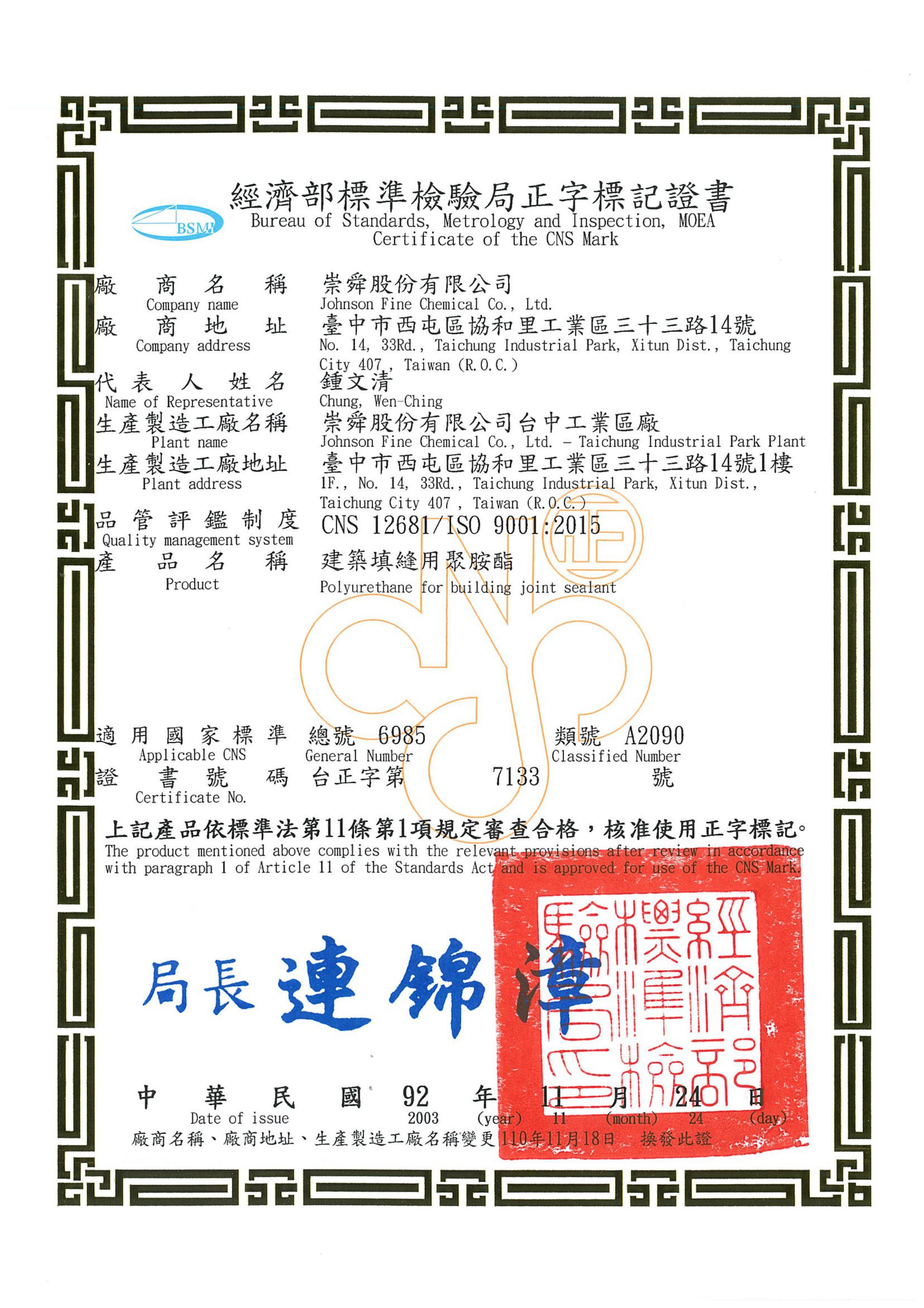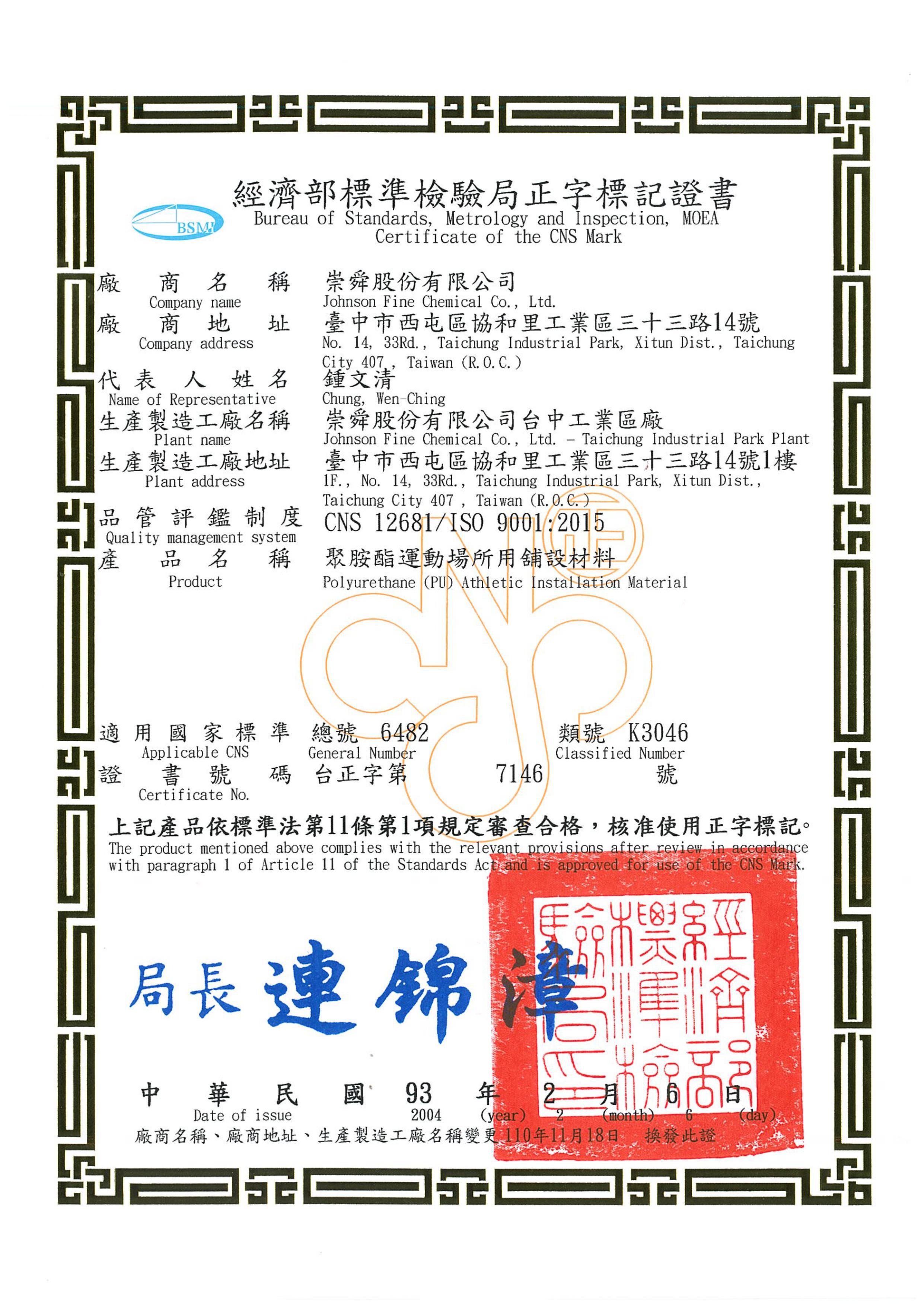 致力於提供客戶最優質的產品,崇舜的PU聚胺酯樹脂塗料符合中華民國國家標準(CNS),身為生產製造工廠,本司採行之品質管理符合指定品管制度(CNS 12681/ISO 9001),爭取顧客信賴以拓展市場,您也可經由CNS正字標記,簡易地選購合宜的優良產品,保障您的權益!