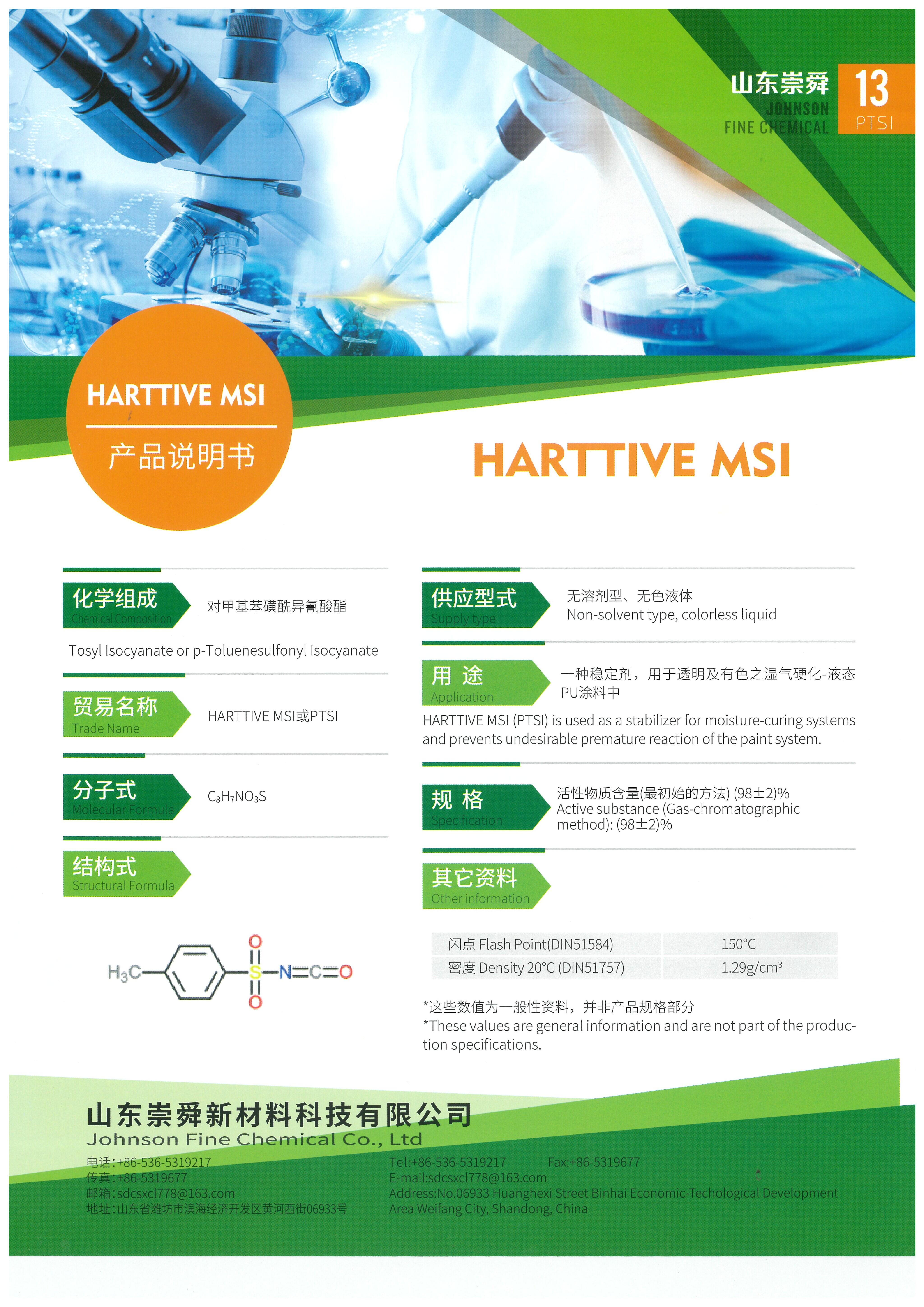 HARTTIVE MSI (PTSI) 是一種具有高反應活性的單異氰酸酯,廣泛用作化學產品中的脫水劑,包括溶劑、填料、顏料和瀝青焦油應用。同時也可用作溶劑型 PU 塗料、密封劑、黏合劑的除濕劑,並用於化學中間體。在 PU 塗料/油漆應用中,HARTTIVE MSI 可以防止不良的過早反應,並充當濕氣固化材料的穩定劑,防止儲存期間變質或變色。