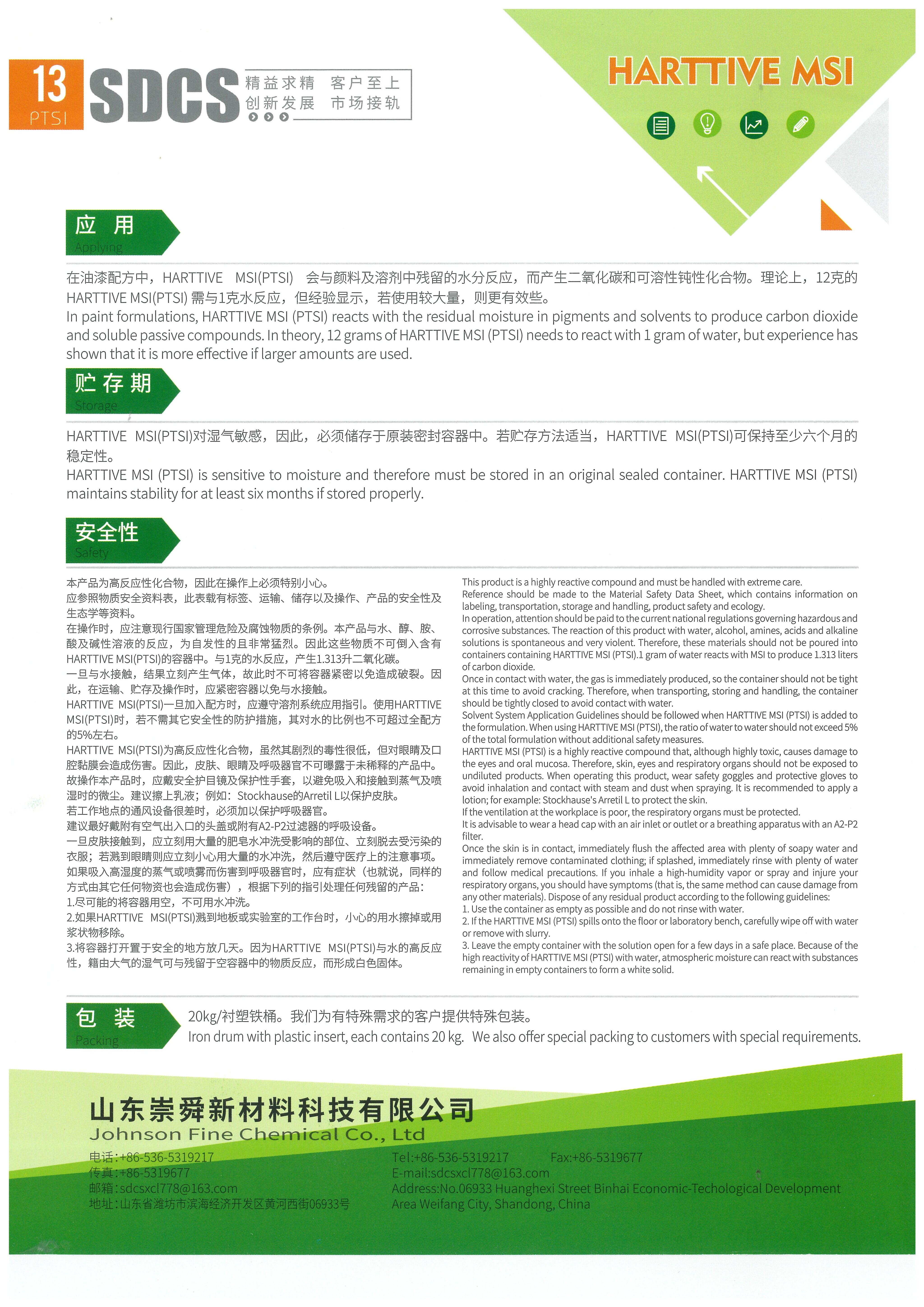 建議將Harttive MSI (PTSI)用作聚合過程中的鏈終止劑和 PU 原料中不需要的反應性官能團的去除劑;在煤焦油 PU 塗料中,Harttive MSI 可用於中和胺和 OH 官能團並去除焦油中的水分,以避免焦油與 PU 預聚物混合時起泡和過早凝膠化。